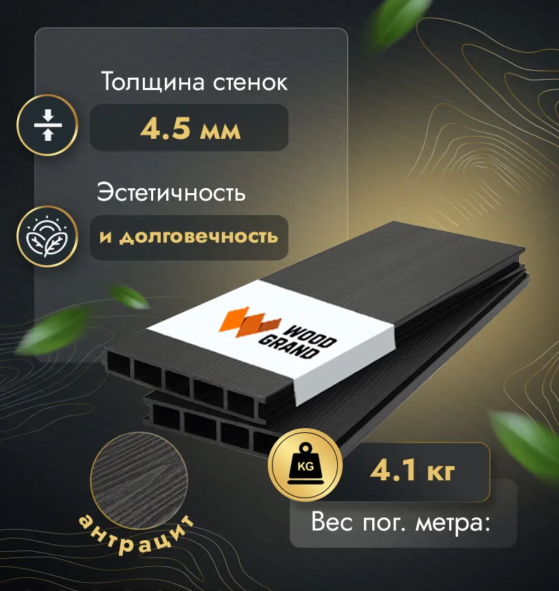 Наша террасная доска из МПК выдерживает до 3318 кг/м2, влагостойкая, не требует ухода.